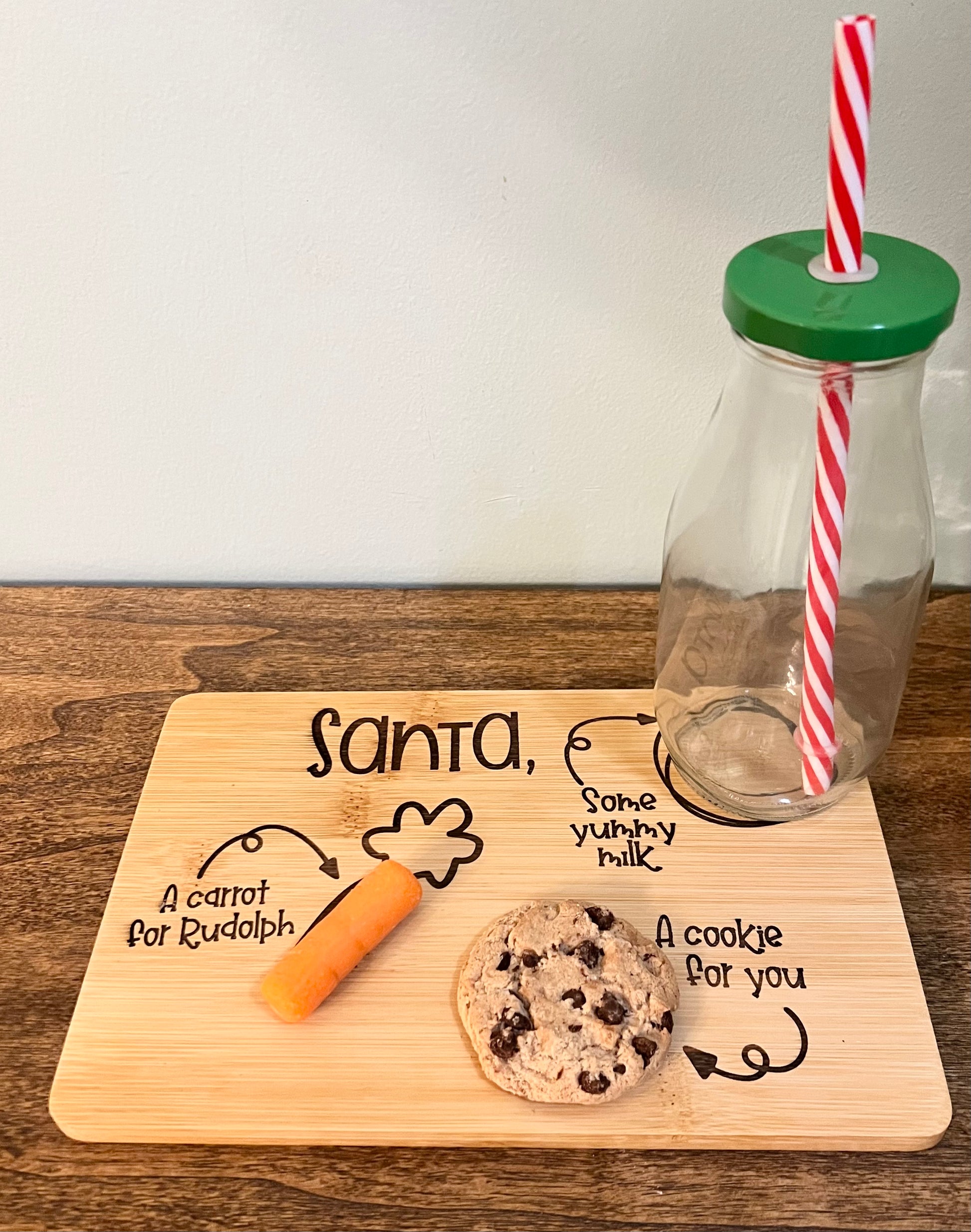 - LASER CUT wooden tray for Santa’s cookie, milk, and a carrot for Rudolph! Dimensions: 8 3/4” W x 6” H x 3/8” D