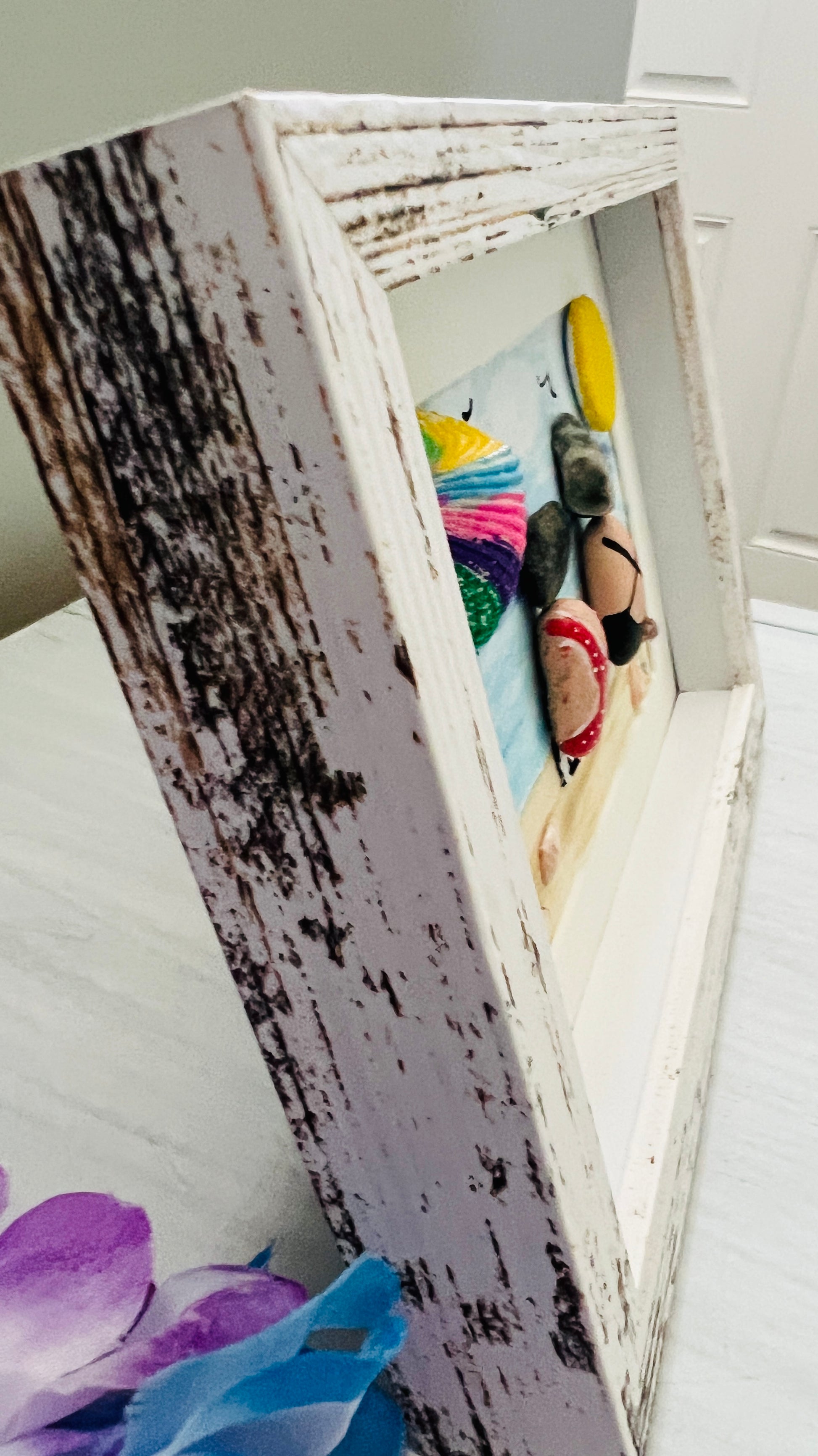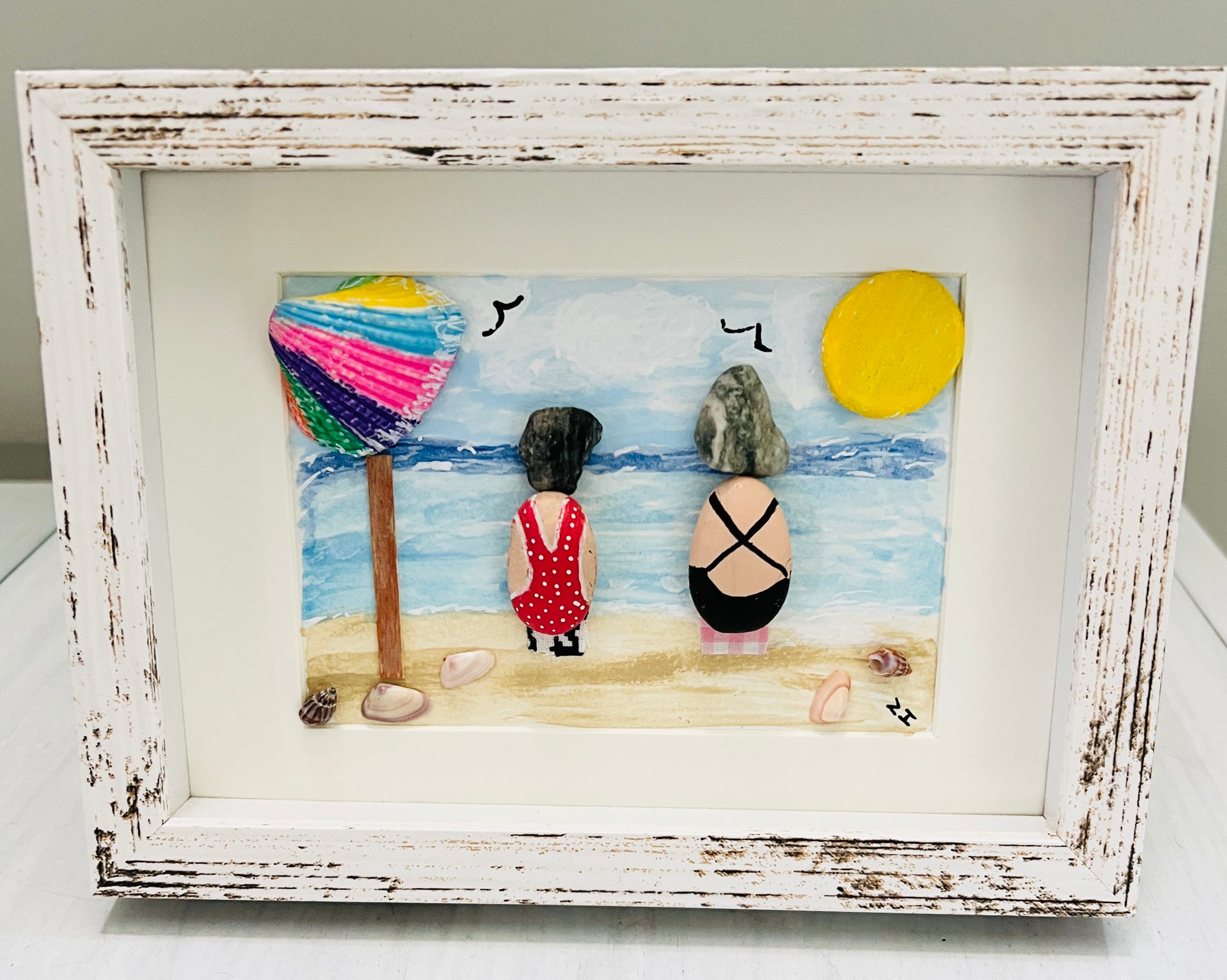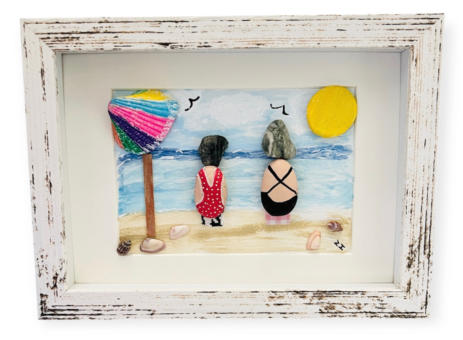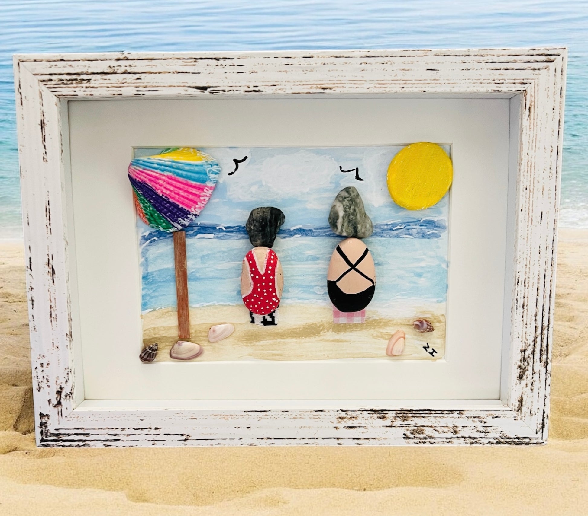 Who doesn’t love making memories at the beach with family, friends or that special someone? Shown are two friends enjoying the view from their spot on their beach towels under an umbrella. See below for details about this hand painted design. No two are the same since these are made with shells and pebbles. These can be customized by selecting the “Custom” option