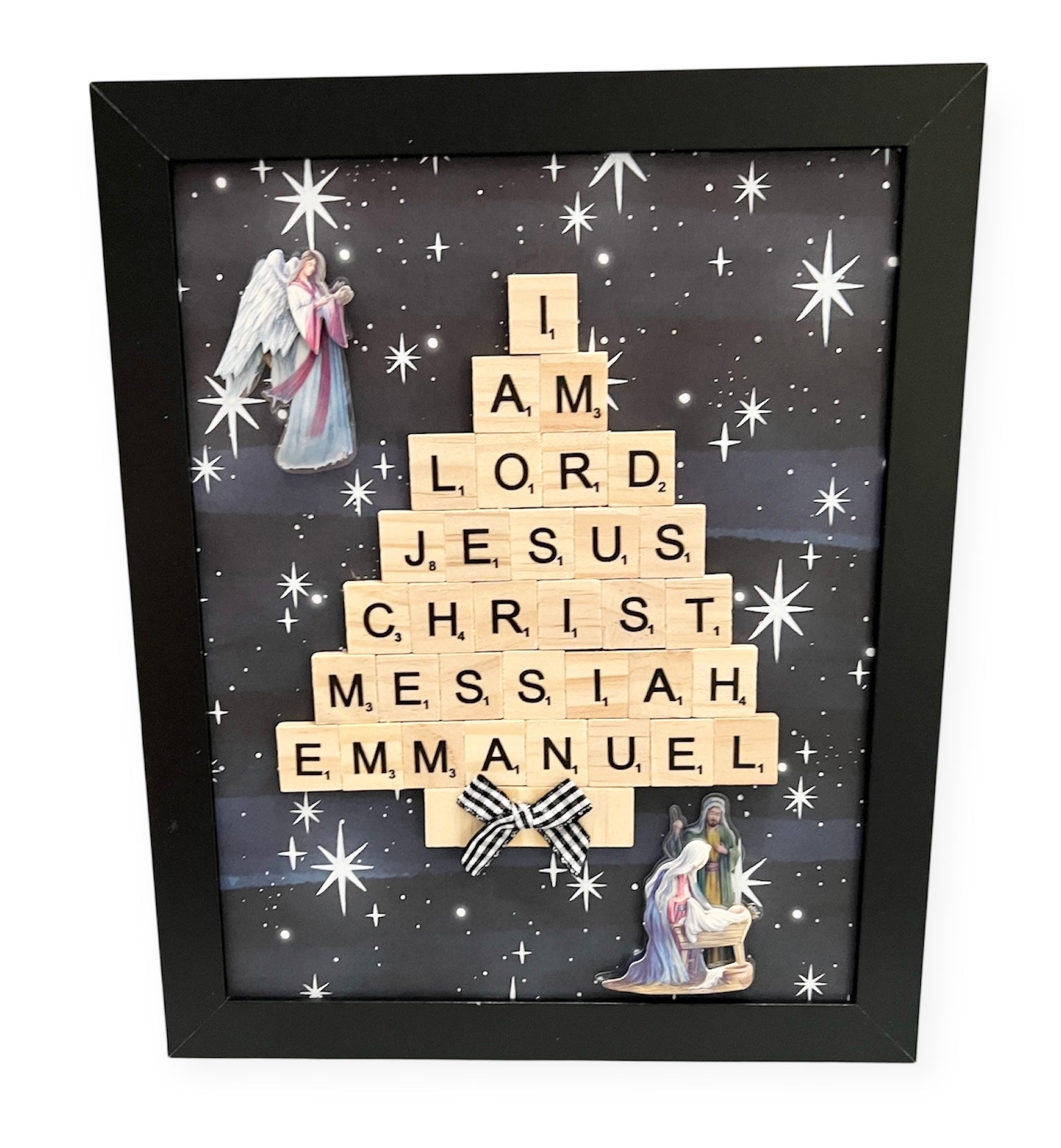 This framed art piece is made with Scrabble tiles and is a wonderful reminder of the true reason for the season.